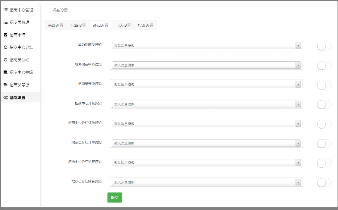成为招商员通知、成为招商中心通知、招商中心升级通知、招商中心分红订单通知、招商员分红订单通知、招商中心分红结算通知、招商员分红结算通知。