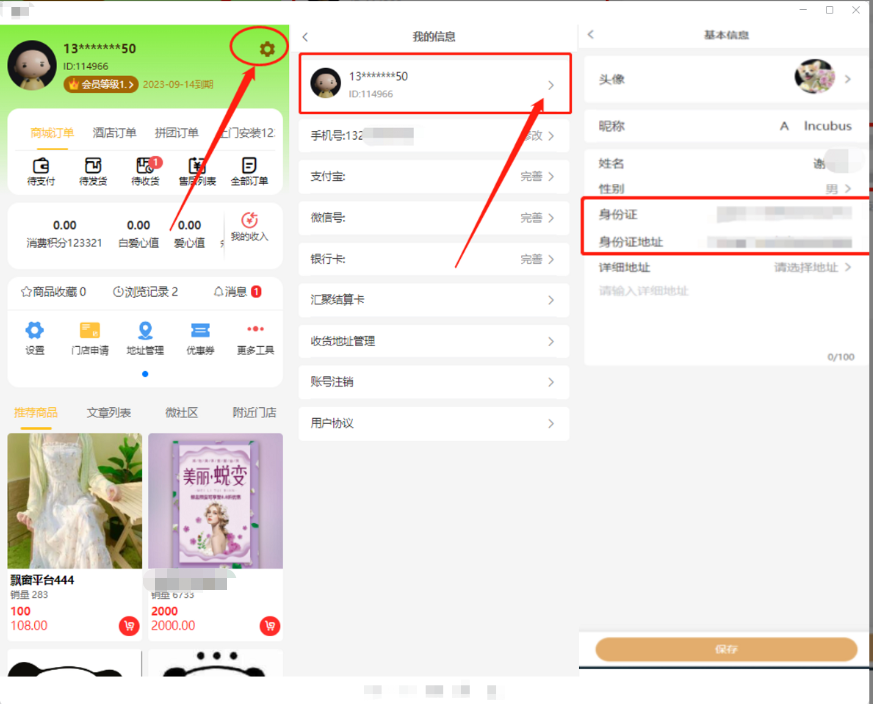 商城后台-会员设置-会员资料设置 新增填写身份证、身份证地址(目前地址项签约非必填)。