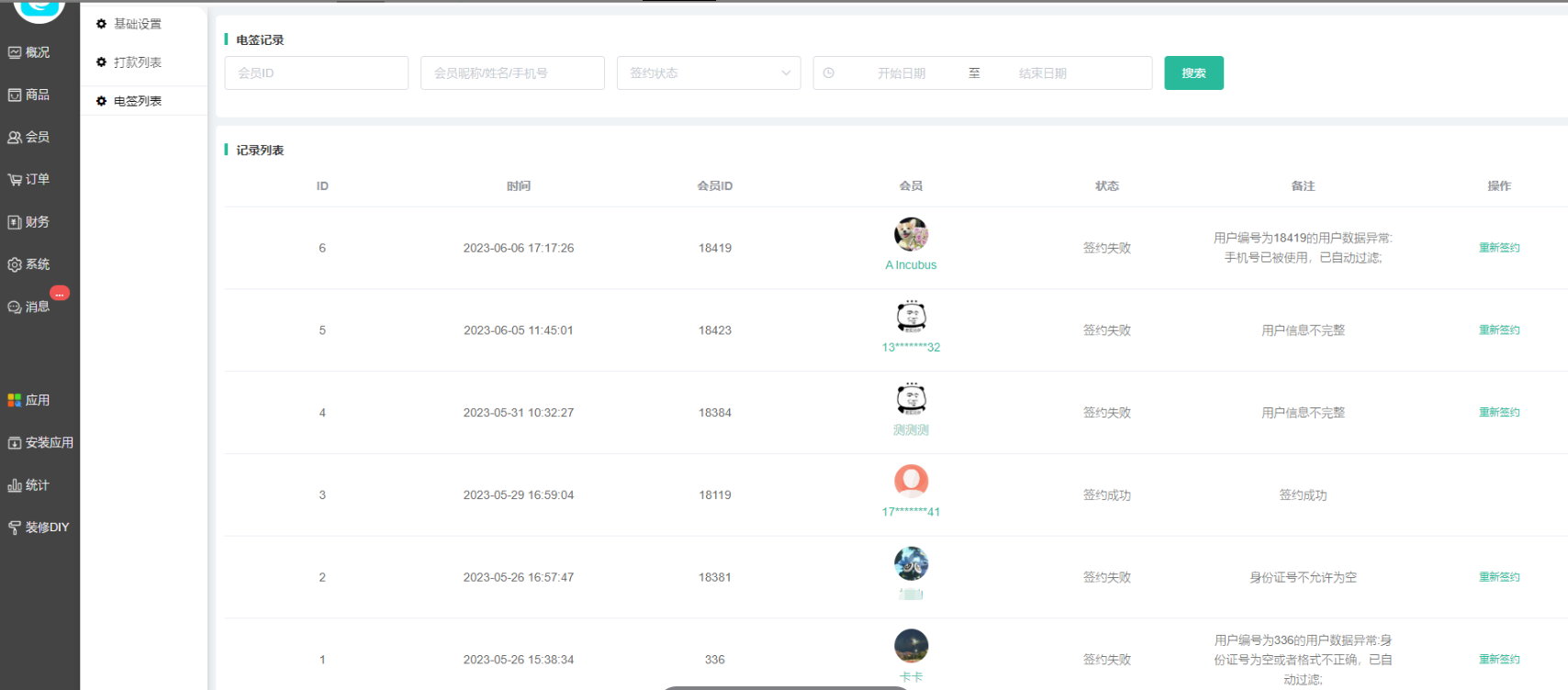 记录会员的签约状态(会员只需要填写身份证信息、姓名、手机号 提现的时候会自动签约,如果签约失败 只有后台电签列表显示 列表会显示失败的原因 修改后点重新签约即可)